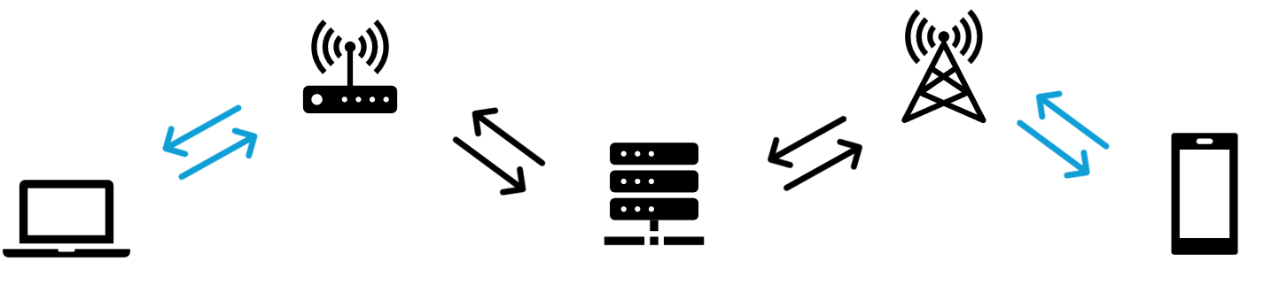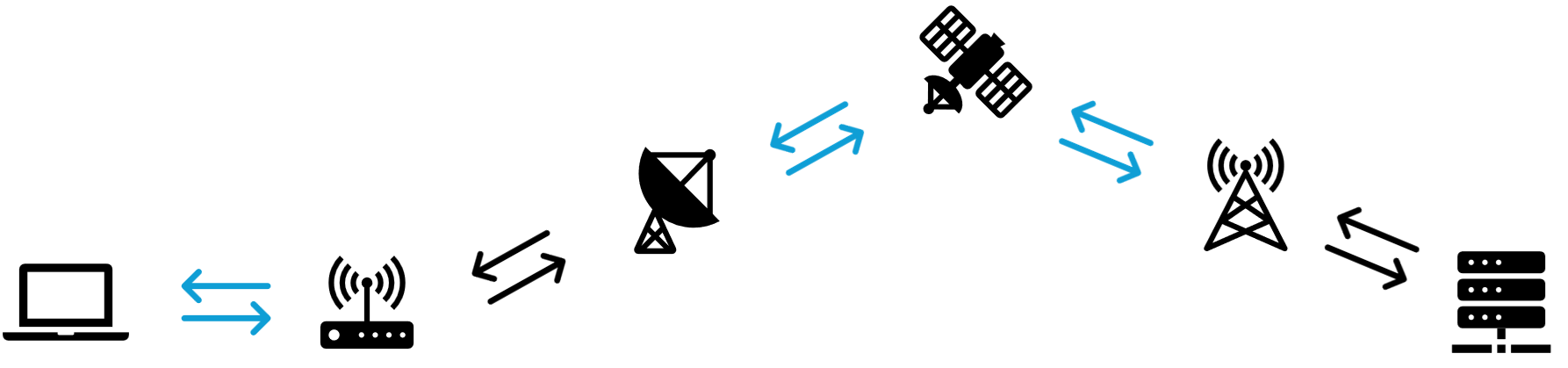 Il client e il server non comunicano direttamente tra loro ma attraverso una serie di terminali chiamati nodi della rete, come il vostro router di casa. Con la connessione internet tradizionale il vostro pc invierà la richiesta al router che via cavo attraverso la fibra ottica arriverà, passando per altri nodi, direttamente al server e da lì le informazioni faranno il percorso inverso. La connessione internet satellitare invece consiste nell’inviare richieste e informazioni passando per i satelliti, in particolare esse passeranno per la vostra personale antenna satellitare, la quale invierà il segnale al satellite che a sua volta trasmetterà in una stazione a terra la quale comunicherà via cavo al server e di nuovo si ritorna indietro.